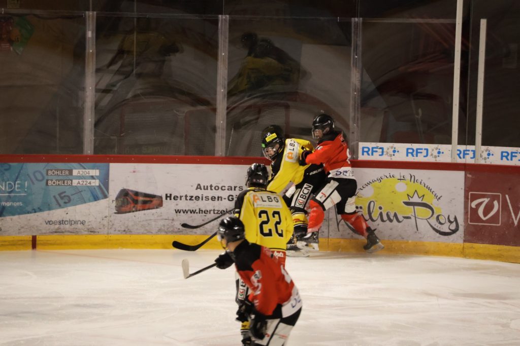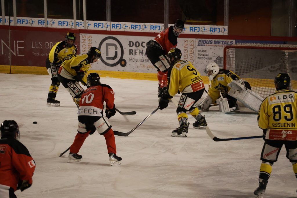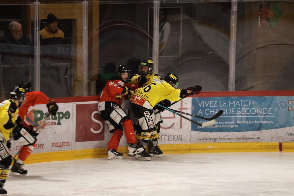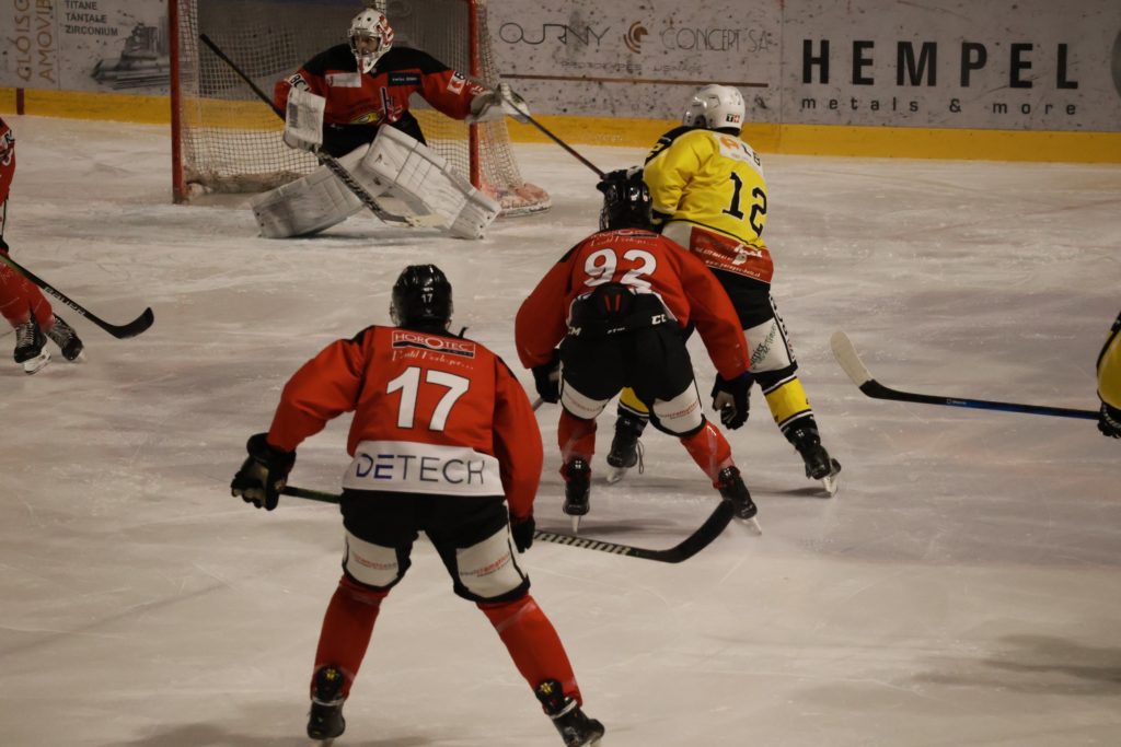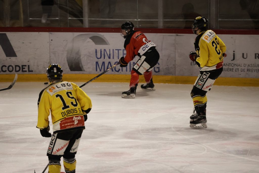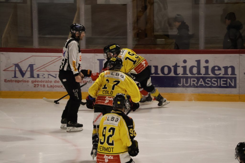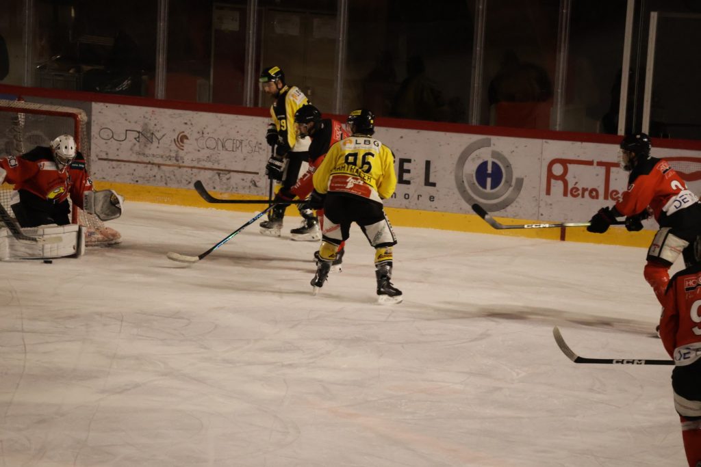 À une minute du terme, Nathan Guichard inscrit le troisième but du HC Franches-Montagnes dans la cage vide, avec l’aide de Lucca Carvalho Beltramelli. Ce but scelle définitivement le sort de la rencontre et confirme la victoire jurassienne.
