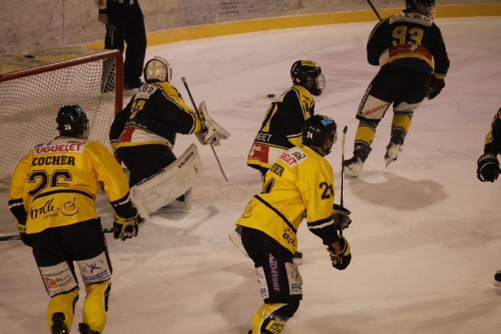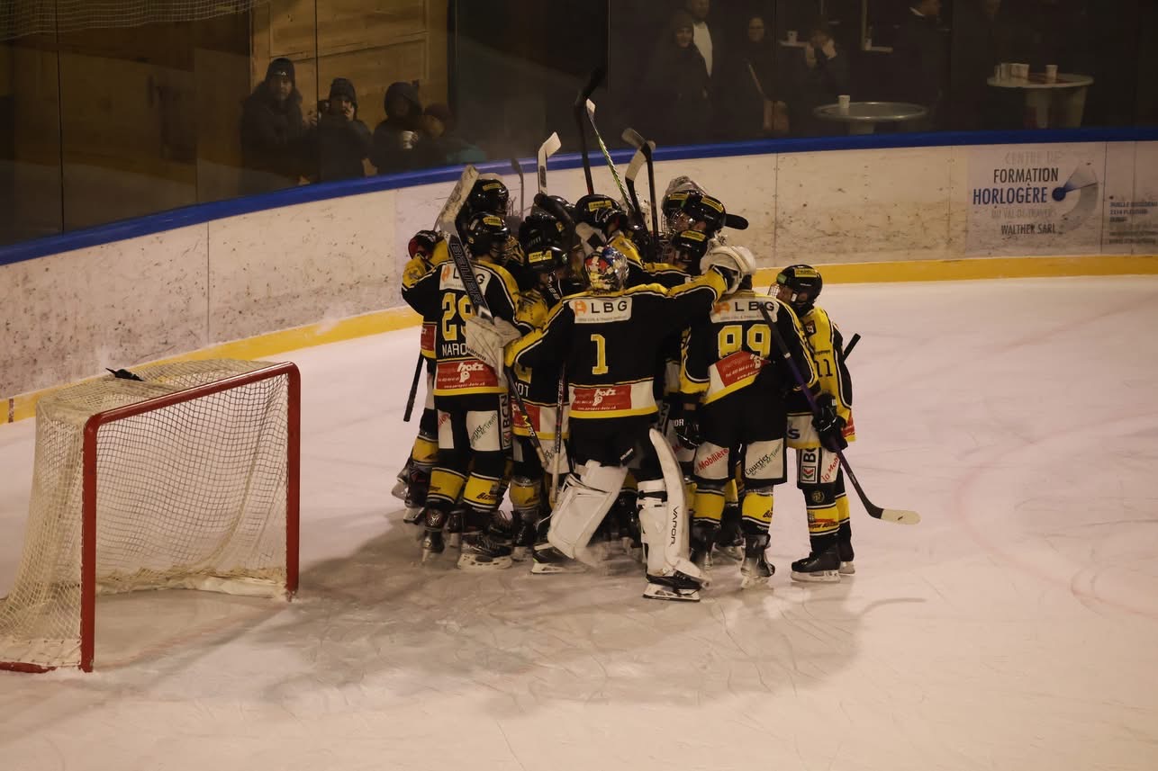 À 55:24, Nigel Tissot transforme le power-play et inscrit le but de la victoire, déclenchant l’explosion de joie dans les tribunes. Corentin Isler et Yann Jeanneret sont crédités des assists sur ce but crucial.