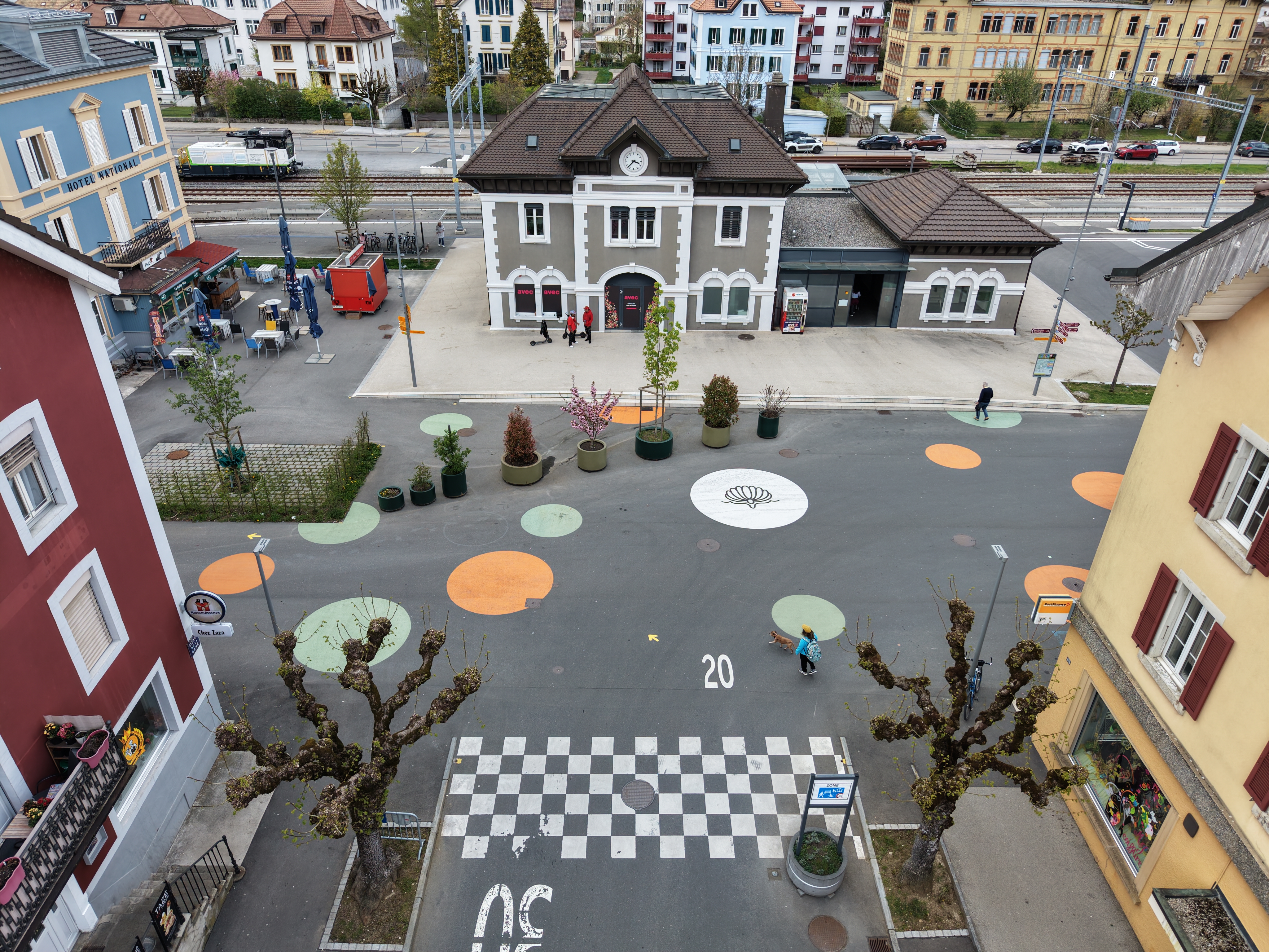 Ce nouveau marquage est une mesure simple et peu coûteuse pour concilier la sécurité de tous les usagers du domaine public. À la gare de Fleurier, le monogramme communal qui symbolise une inflorescence de fleurs d’absinthe a aussi trouvé sa place. Le marquage sera prochainement complété par des lignes tactilo-visuelles, que l’on peut retrouver sur les quais de gare et qui permettent aux personnes malvoyantes de s’orienter plus facilement dans les grands espaces. Dans ce cas, c’est la liaison entre la gare et les trottoirs de l’avenue de la Gare qui sera grandement facilitée.