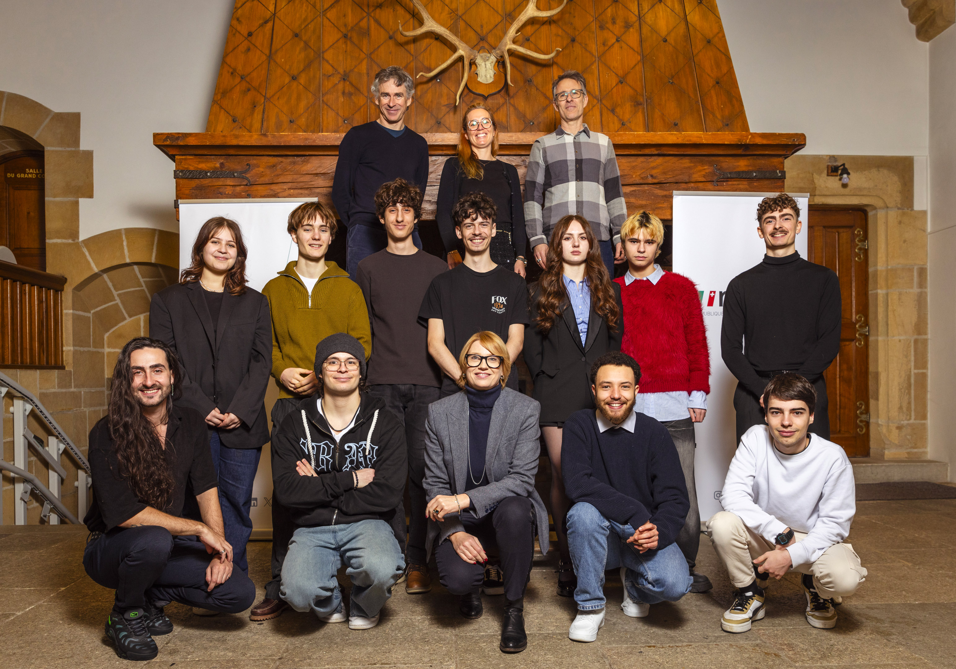 En haut de gauche à droite : Samuel Chalard, réalisateur, enseignant filière Interactive Media Design, École d’arts appliqués du Centre de formation professionnelle neuchâtelois-Pôle Arts Appliqués (CPNE-AA) ; Émilie Voirol, directrice adjointe, École d’arts appliqués du Centre de formation professionnelle neuchâtelois-Pôle Arts Appliqués (CPNE-AA) ; Nicolas Denis, enseignant et coordinateur de la filière Interactive Media Design, École d’arts appliqués du Centre de formation professionnelle neuchâtelois-Pôle Arts Appliqués (CPNE-AA) ; En bas à gauche : Sevan Longobardi, membre du jury ; En bas au centre : Séverine Despland, chancelière d’État ;