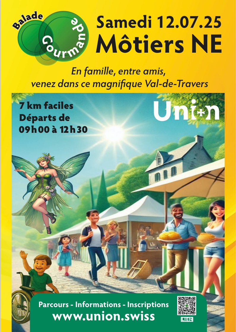 Le pays de la fée verte vous accueille les bras ouverts. Nous vous attendons avec plaisir et un grand sourire à Môtiers NE dans ce magnifique Val-de-Travers. Vous vous baladerez sur une distance de 7 km faciles. Pour les personnes à mobilité réduite un tronçon du parcours est prévu pour vous. Les parkings se trouvent chez Mauler SA ou Etel SA. Le départ et l’arrivée se font au collège primaire. Le parcours emprunte des routes goudronnées, des chemins de forêt et des chemins blancs. Vous commencerez à marcher en direction de Boveresse, puis irez du côté de la Step et longerez l’Areuse pour arriver de l’autre côté de la piscine, côté sud de la route nationale 10. Ensuite vous irez le long du Bied, petit cours d’eau, jusqu’au village que vous traverserez tout en continuant de longer le Bied, en passant près de la cascade et de la sourde, pour arriver à la buvette du stand de tir et déguster le repas de midi. Ce dernier tronçon est plus difficile pour les personnes à mobilité réduite, un itinéraire « Bis » est prévu pour rejoindre la buvette. Pour le retour vous irez rejoindre la rue Vers-Plaine-Fin qui vous amènera au stand du dessert et à la place du Marché du terroir. Un château gonflable attend les enfants. Voilà, c’est la fin de votre balade gourmande. Tout au long du parcours vous pourrez déguster des produits du terroir à boire et à manger. Merci de venir en grand nombre afin de nous permettre de redistribuer le bénéfice de cette balade à des associations caritatives ou à des personnes dans le besoin de notre région.