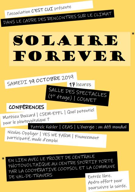 En lien avec le projet de centrale photovoltaïque sur le toit du Centre sportif régional, la toute jeune association vallonnière C’est cui propose une conférence-apéritive samedi 19 octobre, à 17h, à Couvet. Au menu de ce Solaire forever : énergie solaire et financement participatif.