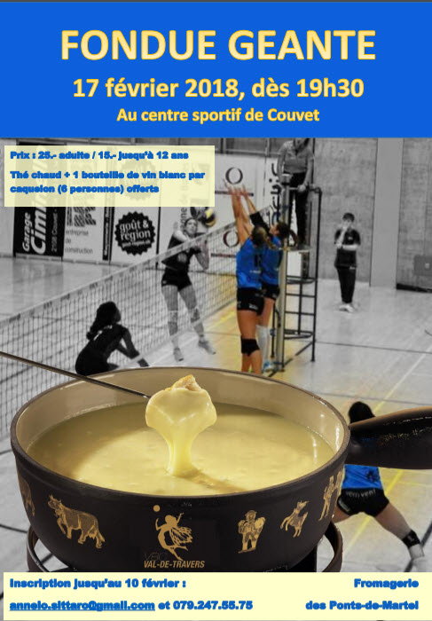 Thé chaud + 1 bouteille de vin blanc par caquelon (6 personnes) offerts Inscription jusqu’au 10 février : [email protected] et 079 247 55 75