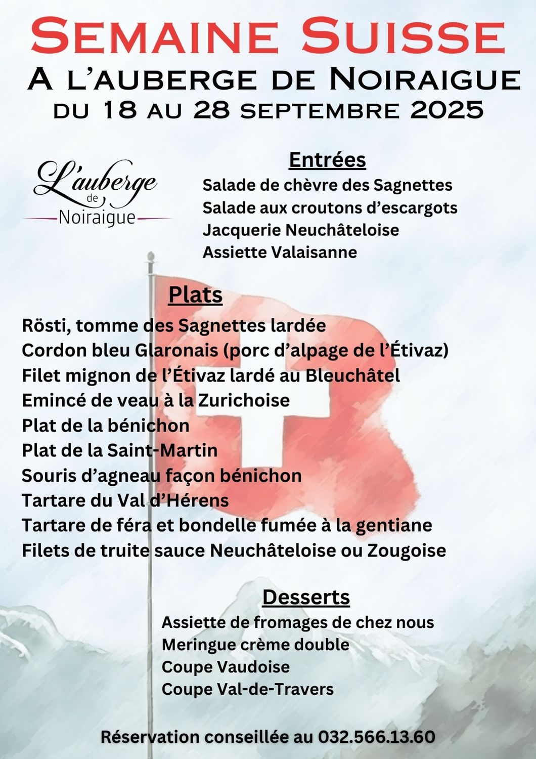 De la fraîcheur des Sagnettes aux traditions valaisannes, en passant par Zurich, la Bénichon et la Saint-Martin, découvrez une cuisine authentique mêlant plats traditionnels et recettes revisitées. Des entrées aux desserts, tout le menu mettra à l’honneur les spécialités suisses.