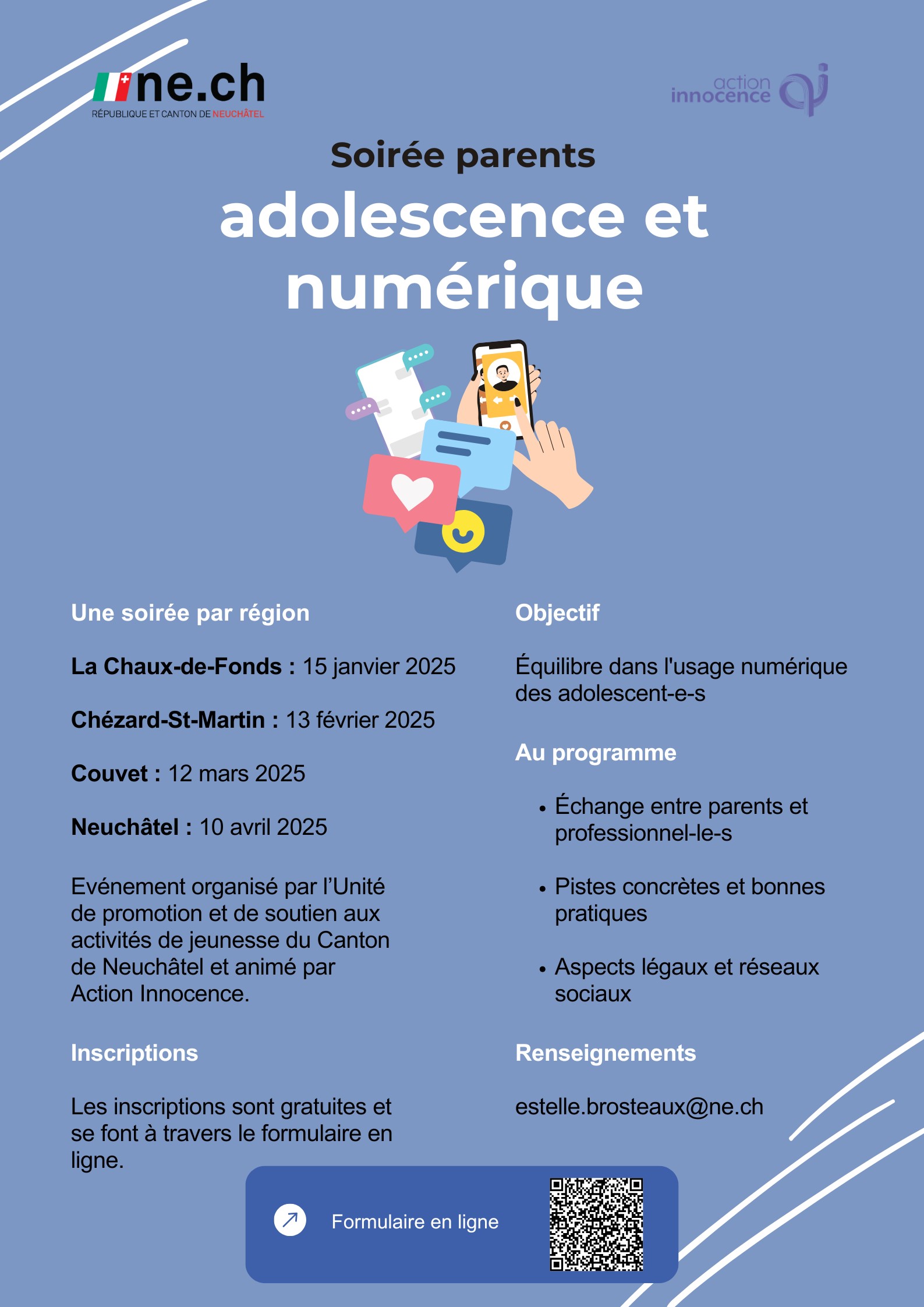 Nous avons le plaisir de vous inviter à l’une de nos soirées parents consacrées à ce sujet, où des échanges enrichissants autour de l’équilibre dans l’usage du numérique des adolescent-e-s seront au cœur des discussions.