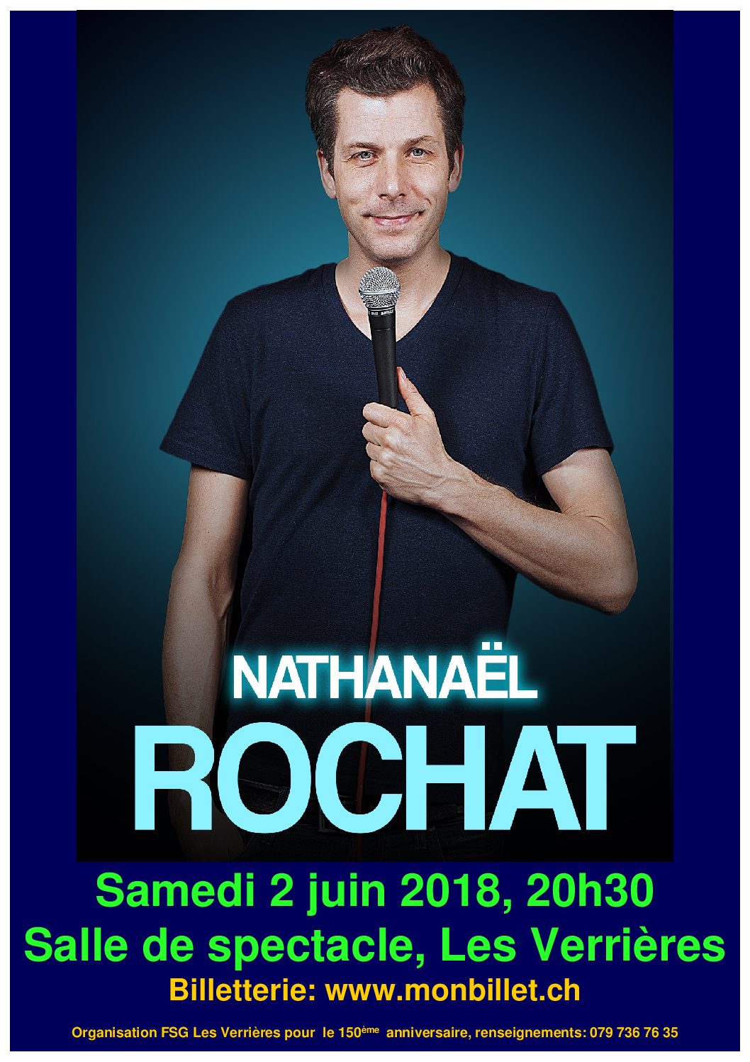 « Pour son 150ème anniversaire, la FSG Les Verrières a décidé de vous faire rire ! Pour cela, elle a invité Nathanaël Rochat ! Nathanaël Rochat est un humoriste suisse