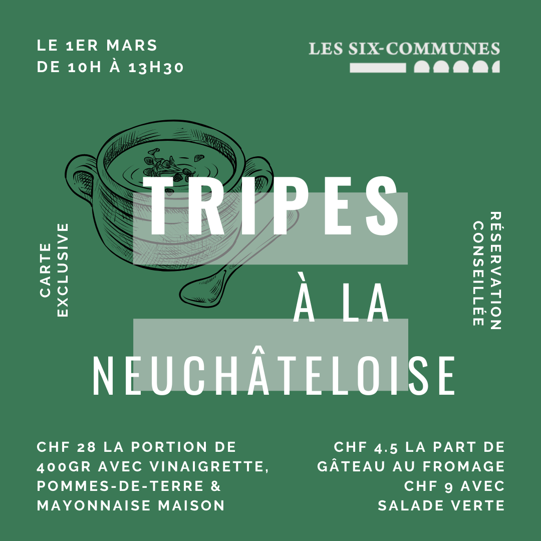 🥘 Tripes à la neuchâteloise & gâteau au fromage 🥘 Le Restaurant Les Six-Communes vous convie mercredi 1er mars de 10h à 13h30 pour une journée tripes à la neuchâteloise &