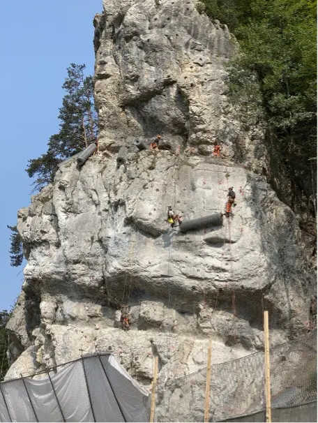 Les équipes ont parfois œuvré dans des conditions extrêmes pour mettre en place tous ces ouvrages, avec des centaines d’heures de travail acrobatique sur corde éprouvant, pour les opérations de percement, pour les clous et pour la mise en place des filets. De strictes contraintes environnementales ont aussi été respectées, avec des périodes de travaux restreintes notamment pour préserver la faune.