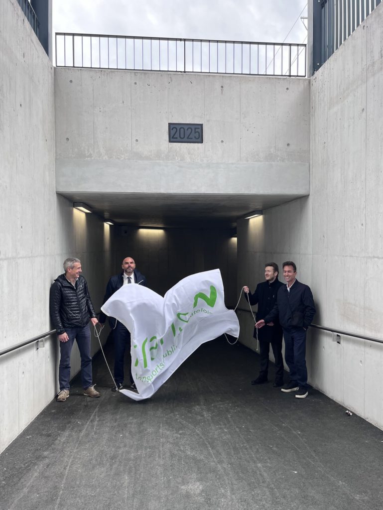 La plaque millésimée 2025 a été dévoilée lors de l’inauguration officielle, en présence de Laurent Favre, conseiller d’État en charge du développement territorial et de l’environnement, Éric Sivignon, président du Conseil communal de Val-de-Travers, ainsi que Raphaël Comte et Cédric Aubry pour transN.