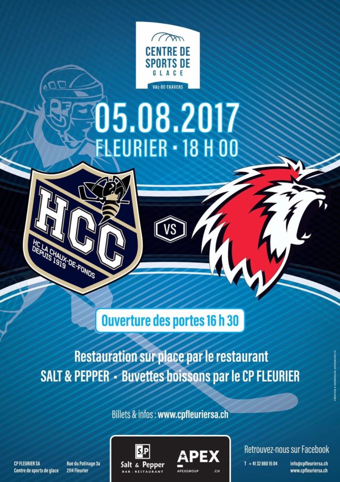 Le Centre de sports de glace du Val-de-Travers se prépare à recevoir ce samedi 5 août 2017, à 18h00, deux clubs de tradition pour une belle affiche. Le Hockey Club La Chaux-de-Fonds (HCC) aura le plaisir de débuter sa saison de glace à Fleurier en y affrontant un premier adversaire de taille, le Lausanne Hockey Club (LHC). Des billets sont en vente dans les commerces locaux ou sur internet et des caisses seront également à disposition des visiteurs le jour du match. Une action « t-shirt HCC » pour les enfants est également prévu en guise d’ouverture des festivités de hockey sur glace.