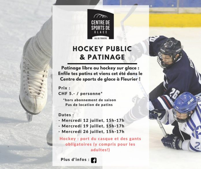 mer12jul15:0017:00Hockey public & patinageCatégorieSports Événement récurrent15:00 - 17:00(GMT+02:00) Patinoire artificielle du Val de Travers à Fleurier