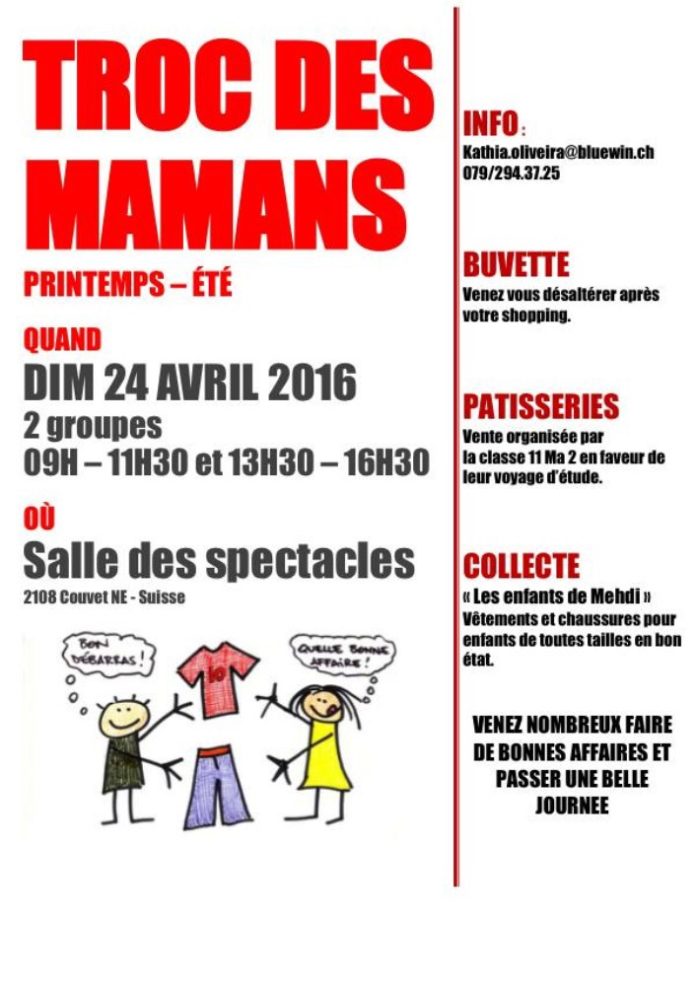 Le Troc des Mamans se tiendra ce dimanche 24 avril à la salle des spectacles de Couvet de 9:30 à 11:30 et de 13:30 à 16:30 !