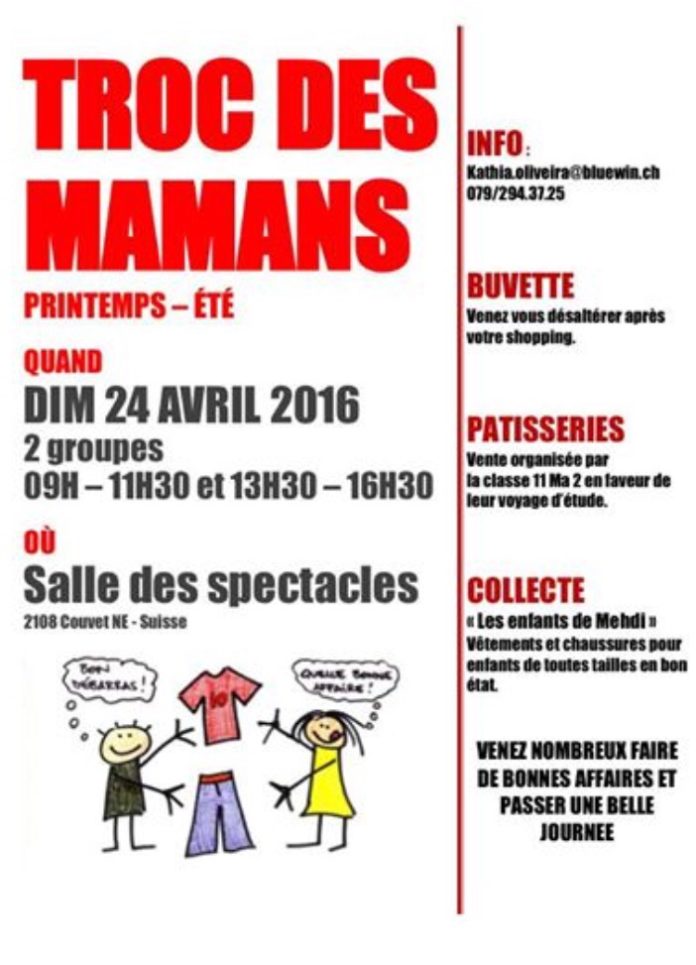 Trouvez votre bonheur au Troc des Mamans le dimanche 24 avril à la Grande salle de Couvet